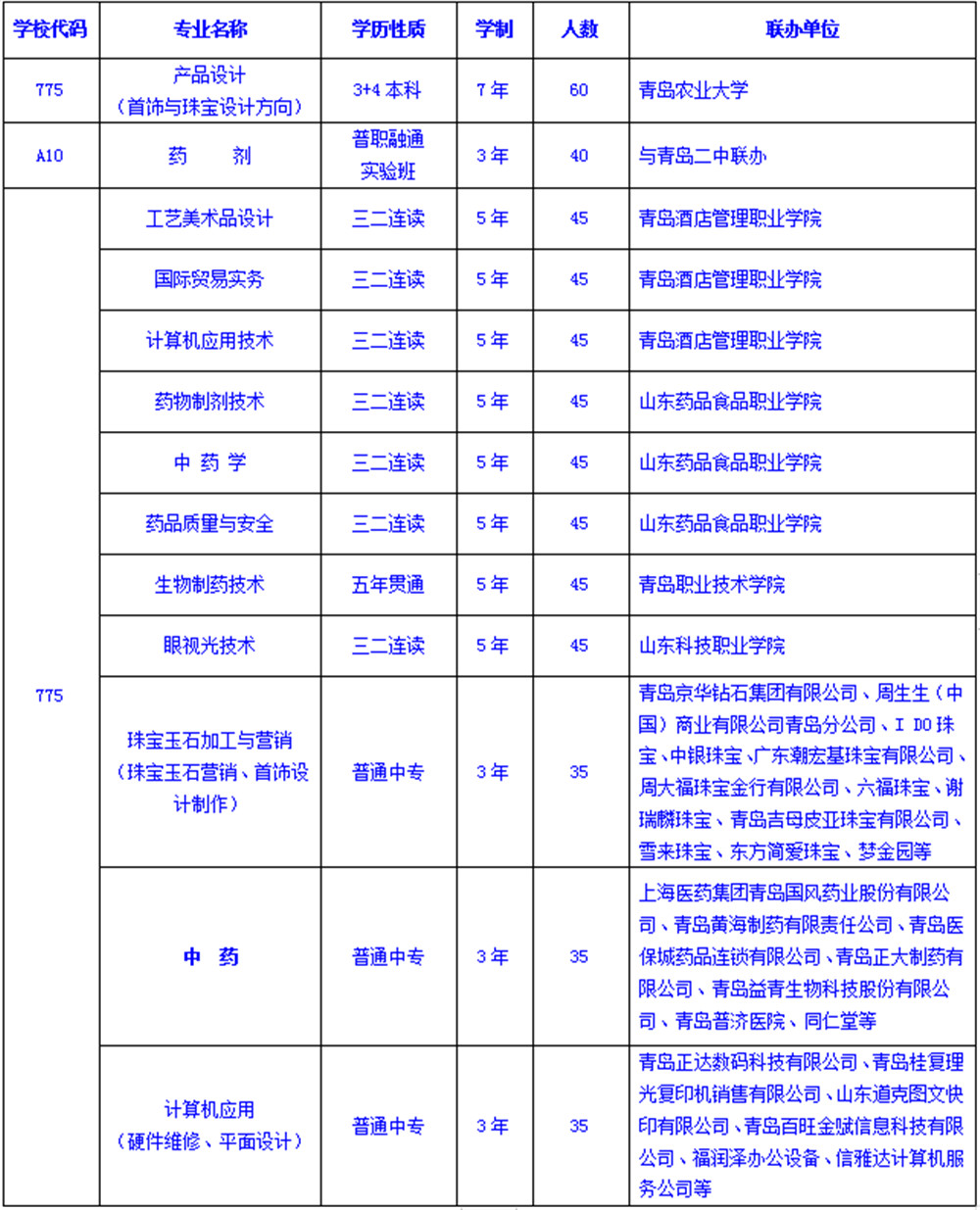 普职融通实验班与青岛二中联办,双方签订人才培养协议,共同制定人才培养方案,部分师资共享。学制三年,重点学习春季高考的文化课和专业基础及技能测试的专业课PP电子,实验班最低录取分数线青岛市统一划定。实验班根据专业特点和学生实际情况,主要组织学生参加春季高考力争升入本科。与青岛二中实施普职融通,特别优秀学生通过二中考核合合格,可转入二中学习。2019年春季高考招收医药类专业本科院校名单:齐鲁医药学院、齐鲁理工学院、山东协和学院、德州学院、泰山学院、菏泽学院、潍坊学院、枣庄学院、山东现代学院等。