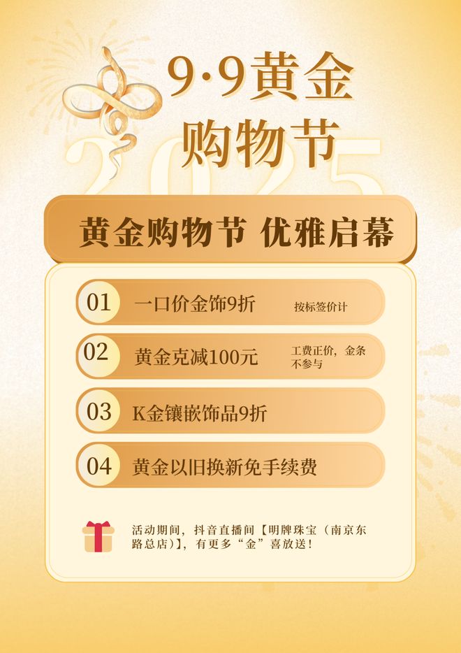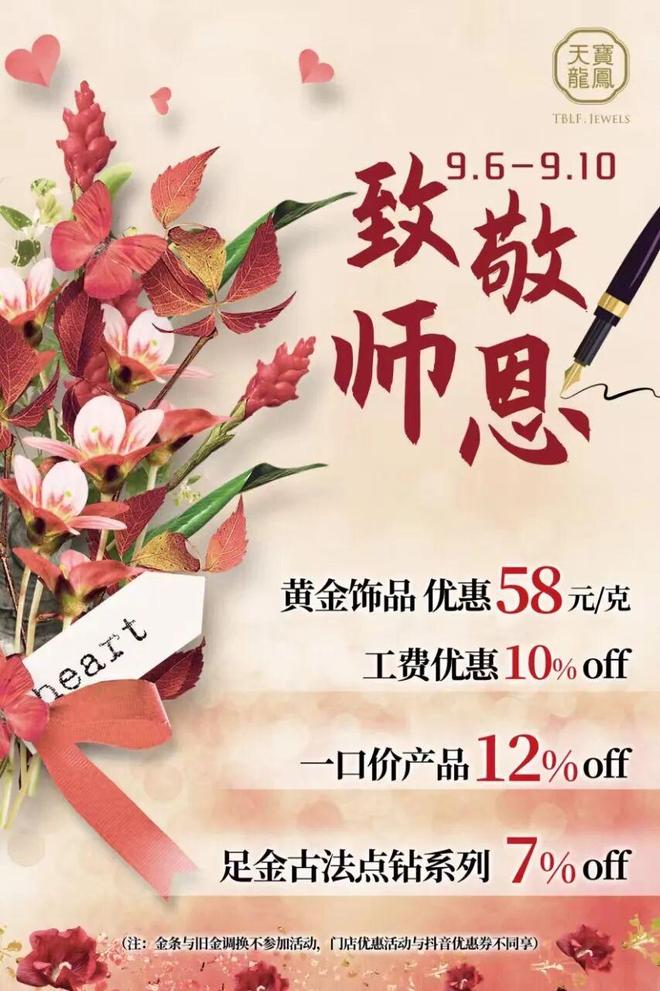 2025年9月9日-9月20日1、 黄金首饰立减100元、工费对折。凭教师证件进店可享折上折,黄金首饰立减120元、工费对折。2、 足金硬金首饰和5G首饰7折优惠;