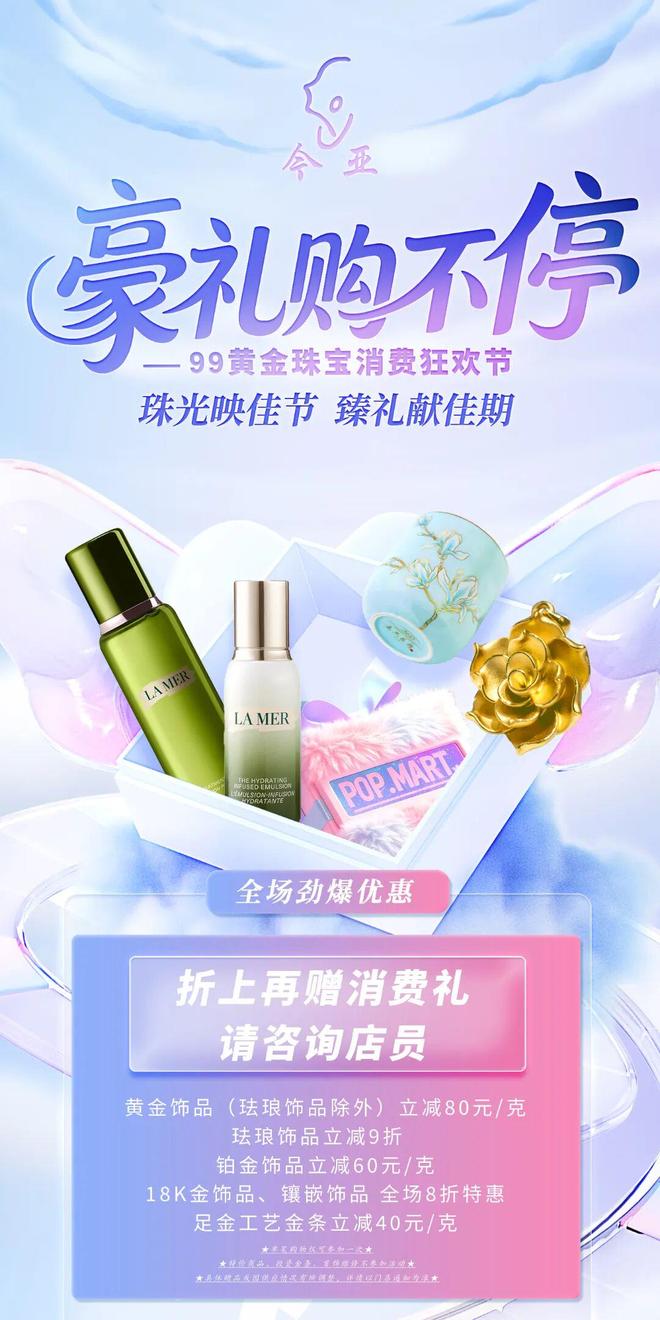 9.9黄金珠宝狂欢节 黄金、铂金饰品每克优惠100元,还有更多惊喜探店垂询。