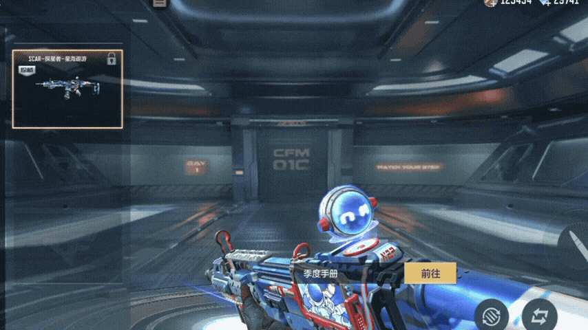 【外观展示】SCAR-探星者-星海遨游是新版本主题万化皮肤,整体色调采用深邃星空蓝为主,枪体侧面嵌有少量的流线型红和金属银,一束红色带贯穿武器主体与全息显示屏。枪身一侧的动态展示窗中,全息投影正循环播放着宇航员穿越星云的震撼场景,配合枪头的仿生电子眼智能传感模组,搭配战术导航激光,整套设计非常具备现代科技质感,浪漫而又高级。